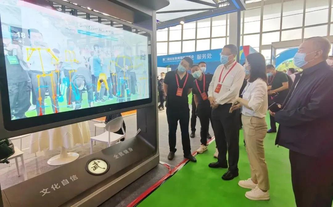 针对全民健身,泰山体育带来了“智能健身驿站”、“AI 武术大屏”等智能产品。凭借“高颜值”、“趣体验”,“武术大屏”前聚集了现场热情的观众一展身手,“切磋武艺”。“泰山体育AI 武术大屏”是一款应用 AR 增强现实技术与人工智能技术相结合来重构传统武术动作体验的智能应用产品,通过人工智能 AI 大屏结合肢体 识别与肢体捕捉算法,将专业武术老师的武术动作进行数字化展示,引导大众参与武术动作教习体验,并对体验者给出相应动作的正确反馈,更有打分竞技比赛趣味,是一款可娱乐可教习的智能武术互动系统。