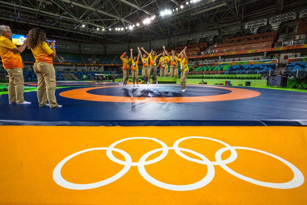 2016年8月18日,在里约奥运会摔跤场馆内,场馆工作人员和志愿者在摔跤垫上合影留念,这届奥运会的摔跤垫来自中国山东泰山体育集团。新华社记者刘彬摄