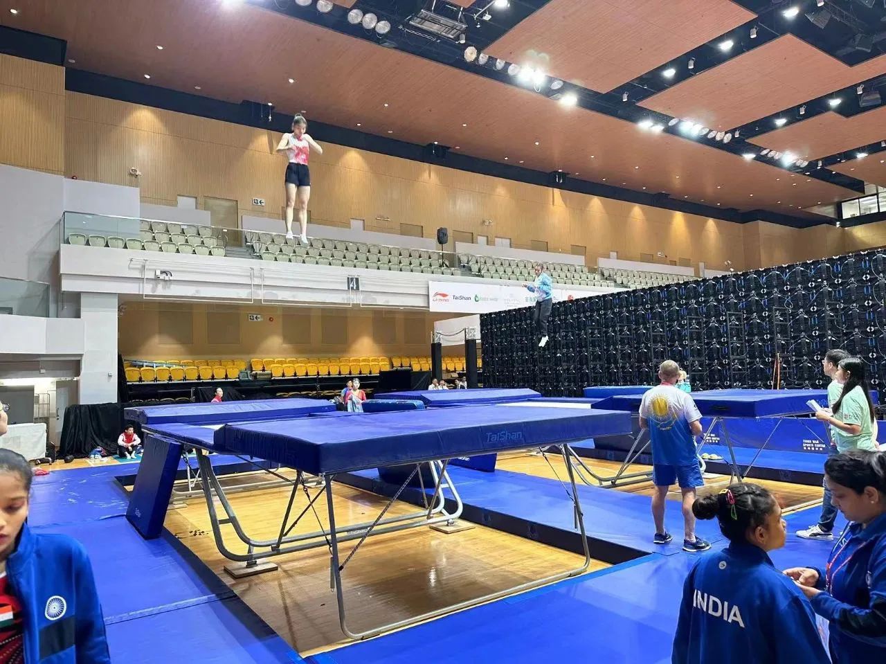 为服务好本届蹦床锦标赛,泰山体育保障人员严格按照赛事服务手册开展工作,从场馆的规划布局、器材的安装调试、标准高度的校准、过程巡检等各个环节,一丝不苟、严谨细致,确保蹦床器材安装的准确无误,始终践行国际赛场上的中国标准,见证泰山体育全领域规划、设计、制造、集成、运营、服务一站式解决方案的发展理念。