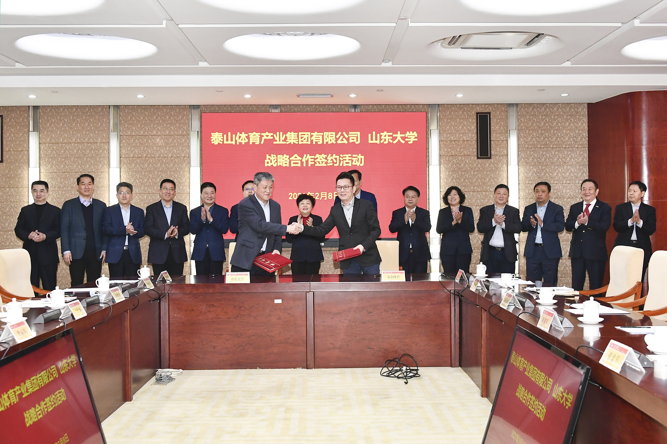 为积极建设“体育强国”、“健康中国”、“健康山东”,努力实现产教融合与产学研深入合作,2021年2月8日,泰山体育产业集团与山东大学战略合作签约仪式在山东大学中心校区隆重举行。山东省体育局党组成员、省体育总会专职常务副主席隋拥军,山东省工信厅二级巡视员张忠军,山东省科技厅总工程师孙高祚,省体育局体育产业发展服务中心主任翟培建,山东省科技厅张大瑞,德州市副市长马俊昀,乐陵市委副书记、市长陈光春,山东大学党委副书记、校长樊丽明,全国政协委员、im电竞·(中国)电子竞技平台 董事长卞志良等领导出席仪式。签约仪式由山东大学党委副书记王君松主持。