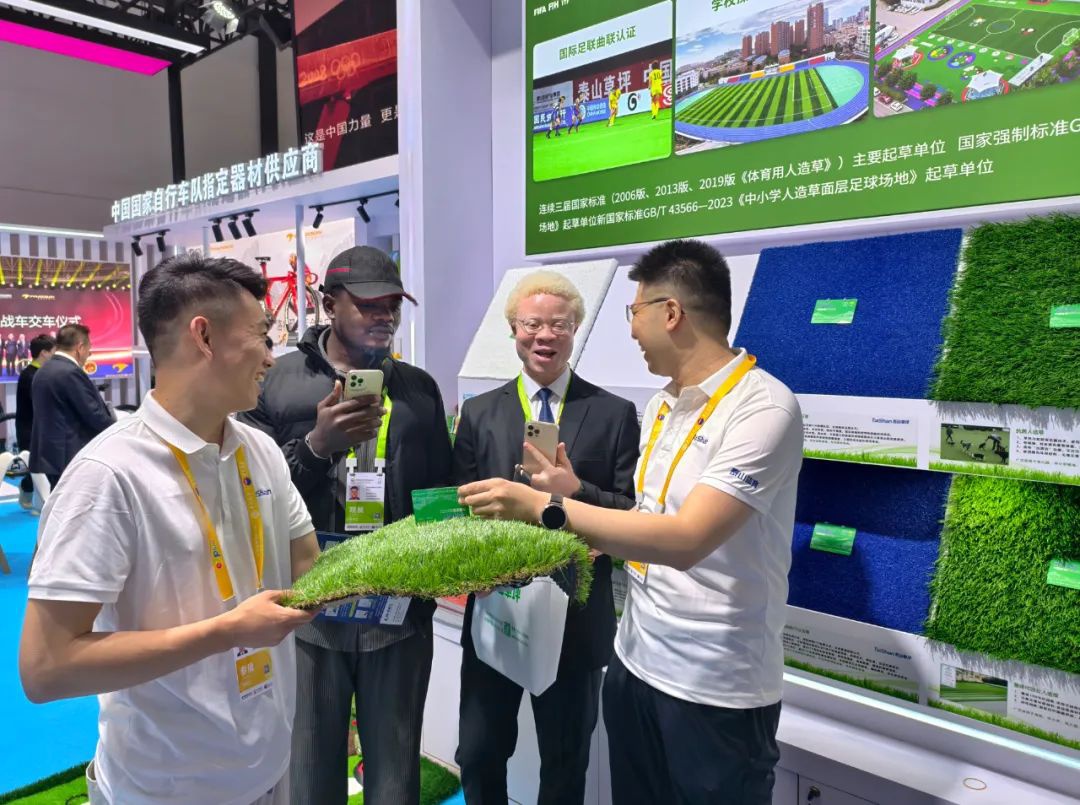 来自非洲的参展客商,对泰山“负氧离子”人造草坪非常感兴趣,他们又是拍照又是搜集材料,想在当地推广。